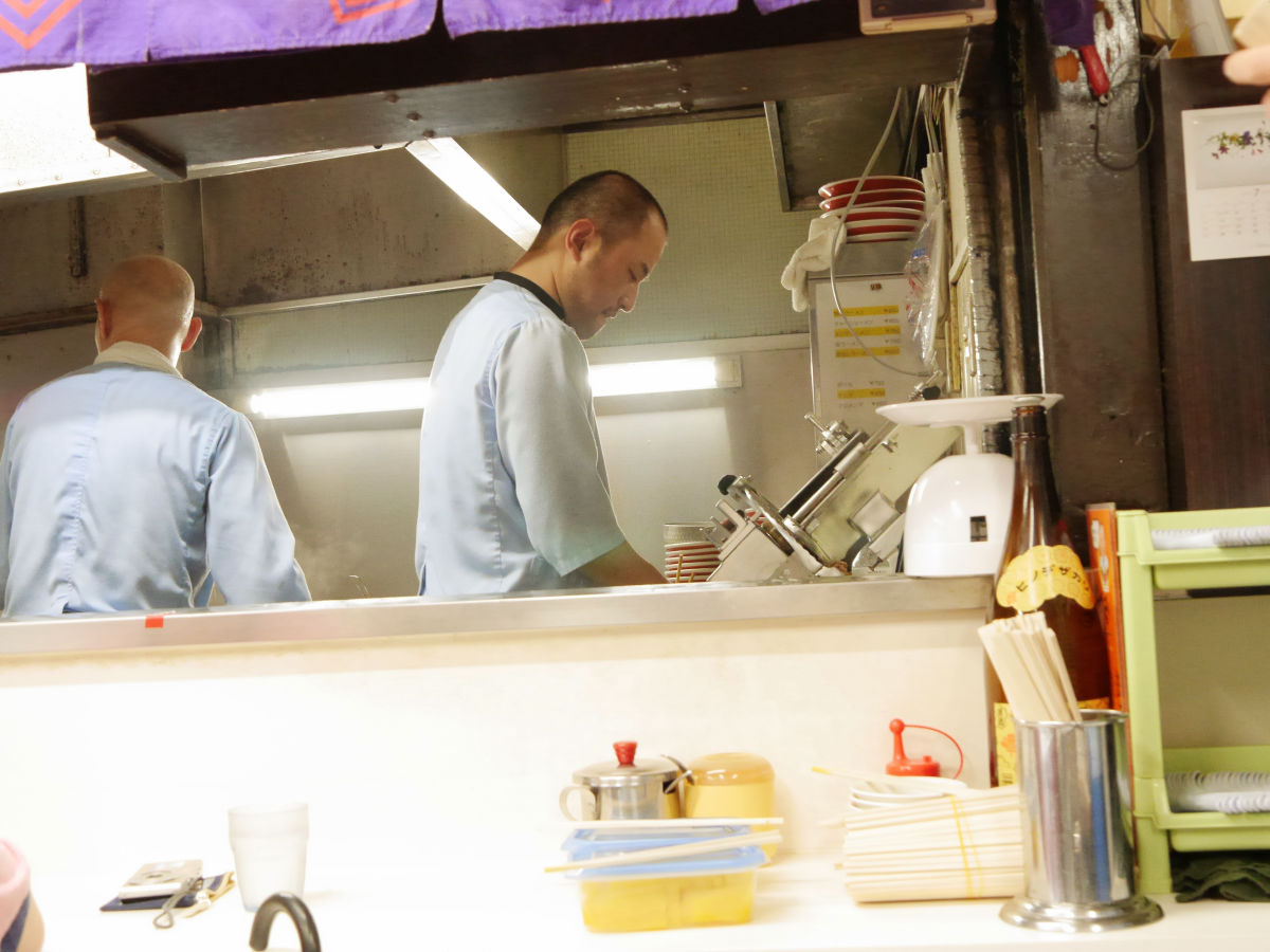 チャーシューは切りたてのものが提供されるようで、注文が入ると機械でチャーシューを切っていました。
